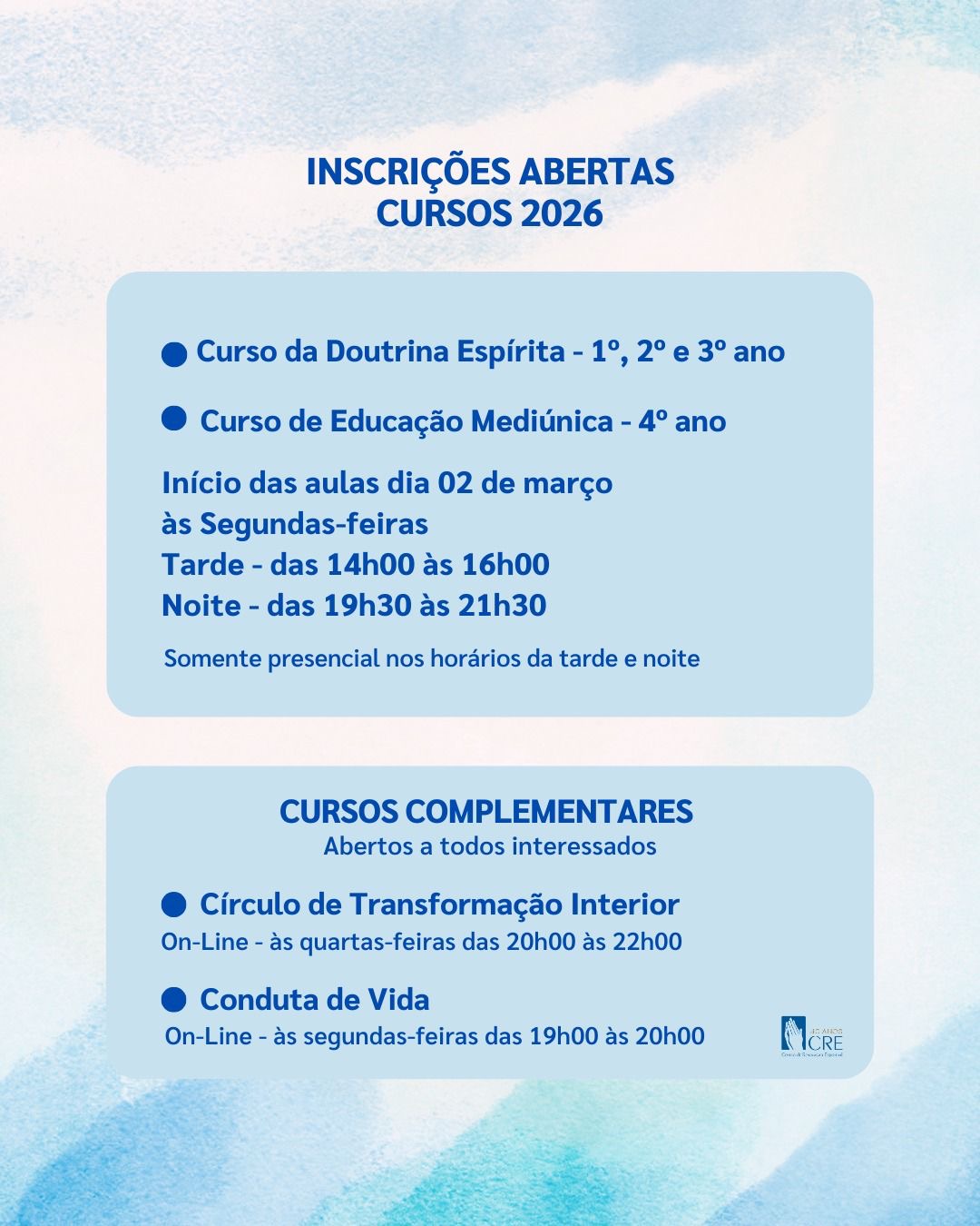 Inscreva-se nos cursos do CRE Inscreva-se pelo link abaixo para os Cursos da Doutrina Espírita (1º ao 3º ano), Curso de Educação Mediúnica (4º ano) e Cursos Complementares: https://docs.google.com/forms/d/e/1FAIpQLSf2iC5gC6zGK8XNheeCXtRwYns2HYh_AA7YnBoi0LC7Hrpo0w/viewform?usp=header Informações importantes: Os Cursos da Doutrina Espírita (1º ao 3º ano) e Educação Mediúnica serão exclusivamente presenciais. Os Cursos Complementares serão exclusivamente online. Horários das aulas […]