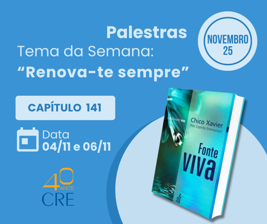 O tema da palestra da semana será “RENOVA-TE SEMPRE” – Cap 141do livro “Fonte Viva” pelo espírito Emmanuel, psicografado por Francisco Cândido Xavier “Ainda que o nosso homem exterior se corrompa, o interior, contudo, se renova, dia a dia.” Paulo (II Coríntios, 4:16) https://www.facebook.com/share/1GCH9ZV4w5/?mibextid=wwXIfr www.youtube.com/CRECentroDeRenovacaoEspiritual instagram.com/CreCentroDeRenovacaoEspiritual/