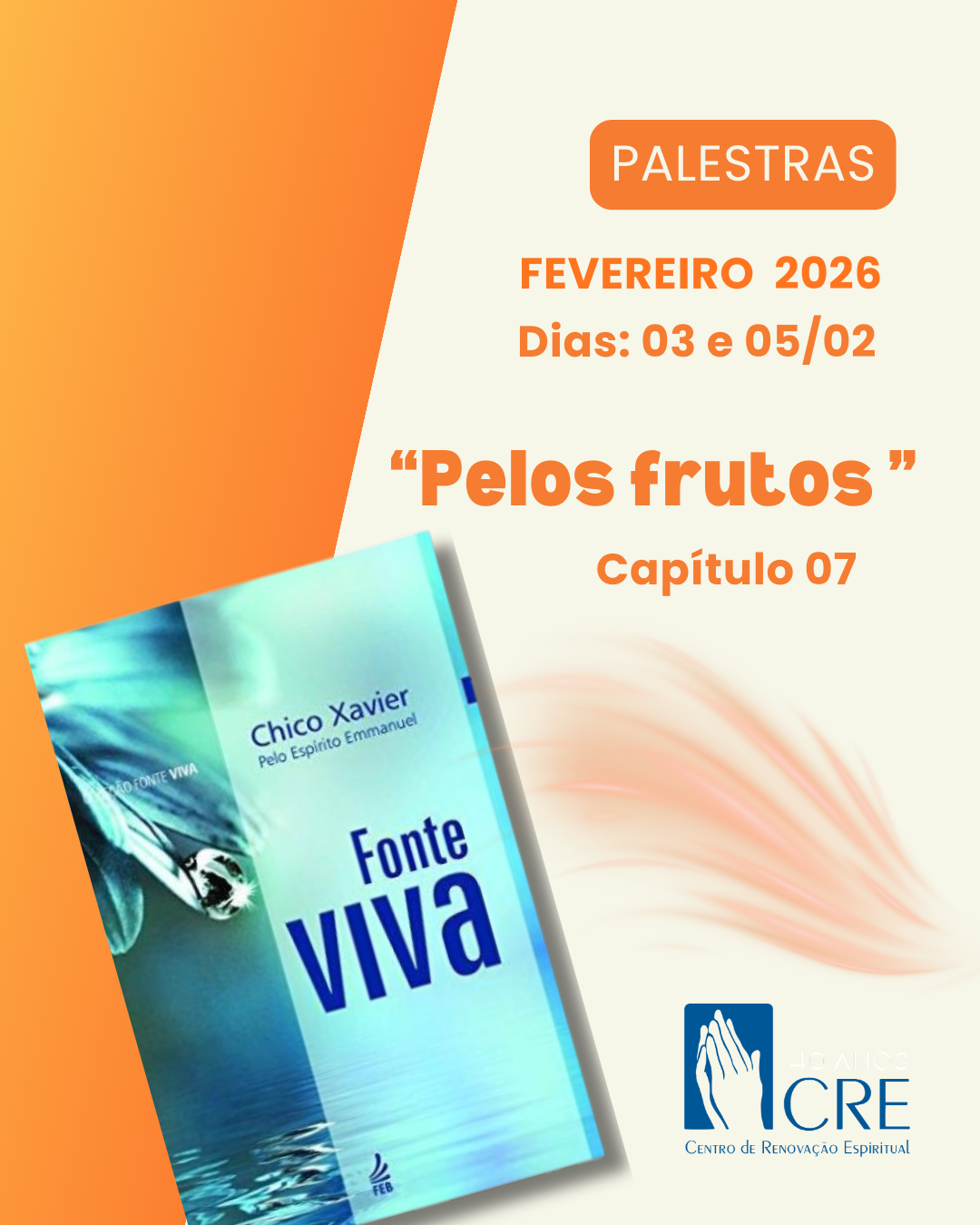 O tema da palestra desta semana será “PELOS FRUTOS” Cap 07 do livro Fonte Viva, pelo espirito Emmanuel, psicografado por Francisco Cândido Xavier. “Por seus frutos os conhecereis..” Jesus (Mateus, 7:16) fb.com/CreCentroDeRenovacaoEspiritual/ www.youtube.com/CRECentroDeRenovacaoEspiritual instagram.com/CreCentroDeRenovacaoEspiritual/10