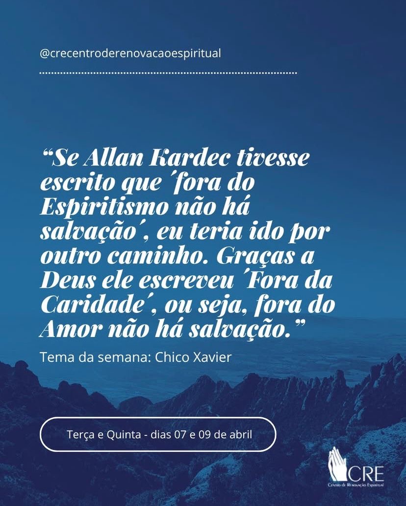 O tema da palestra desta semana será “Chico Xavier” fb.com/CreCentroDeRenovacaoEspiritual/ www.youtube.com/CRECentroDeRenovacaoEspiritual instagram.com/CreCentroDeRenovacaoEspiritual/10