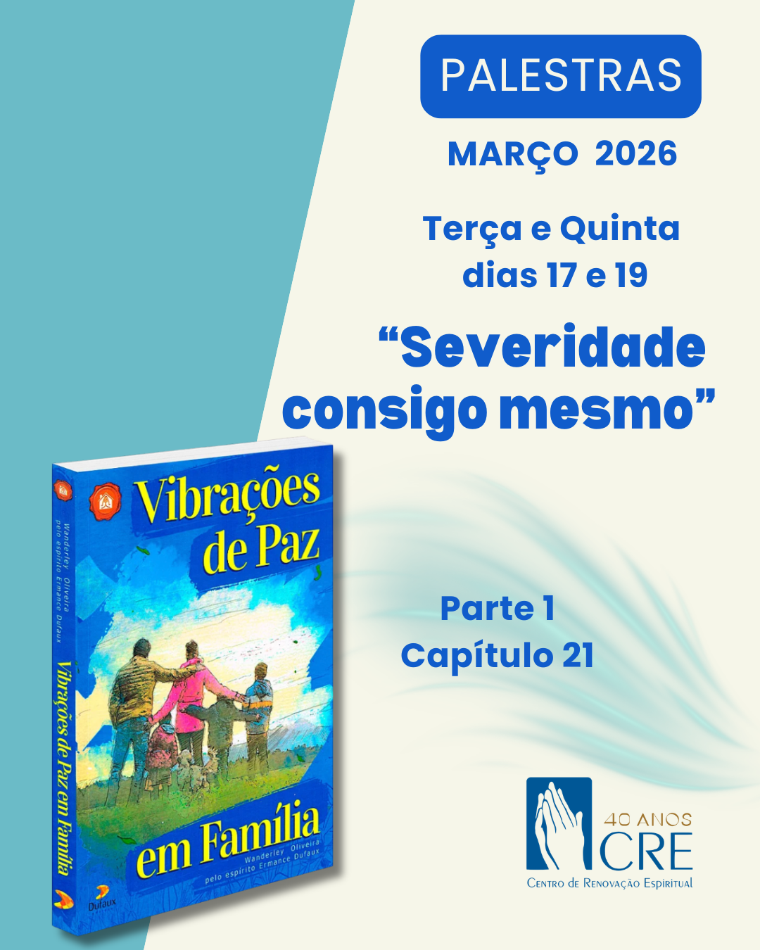 O tema da palestra desta semana será “SEVERIDADE CONSIGO MESMO” cap 21 – Parte 1 do livro Vibrações de Paz em Família , pelo espirito Ermance Dufaux, psicografado por Wanderley de Oliveira “Mas, sobretudo, tende ardente amor uns para com os outros; porque o amor cobrira a multidão dos pecados.” I Pedro, 4:8 fb.com/CreCentroDeRenovacaoEspiritual/ www.youtube.com/CRECentroDeRenovacaoEspiritual […]
