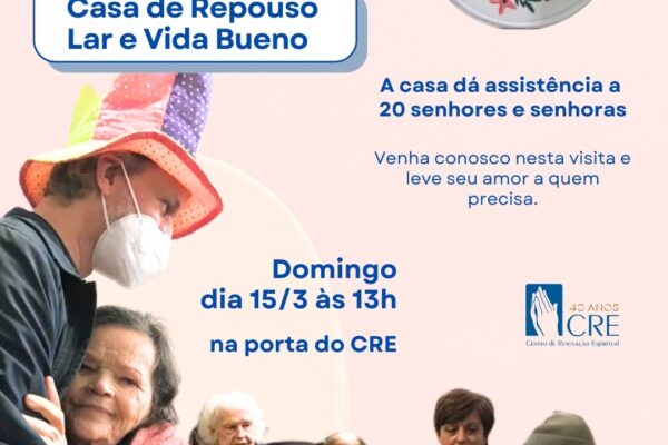 *Convite Especial – Visita à Casa de Repouso Lar e Vida Bueno* No domingo, dia *15/03 (domingo)*, faremos uma visita à Casa de Repouso Lar e Vida Bueno, que acolhe e assiste 20 senhores e senhoras. Nosso encontro será às 13h, na calçada em frente ao CRE. Para quem precisar, ofereceremos carona. Estamos arrecadando produtos […]