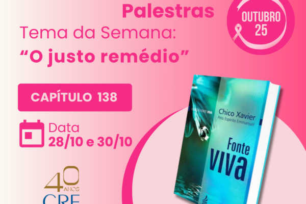 O tema da palestra da semana será “O JUSTO REMEDIO” – Cap 138 do livro “Fonte Viva” pelo espírito Emmanuel, psicografado por Francisco Cândido Xavier “Quanto, porém, à caridade fraternal, não necessitais que vos escreva, porque já vós mesmos estais instruídos por Deus que vos ameis uns aos outros.”...