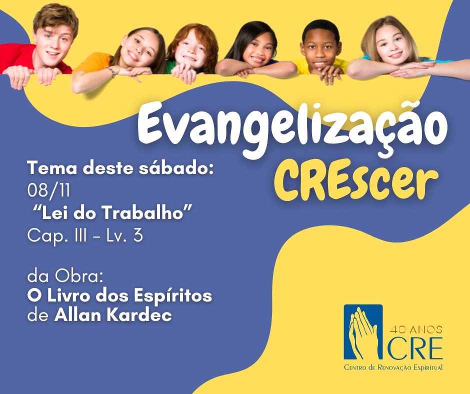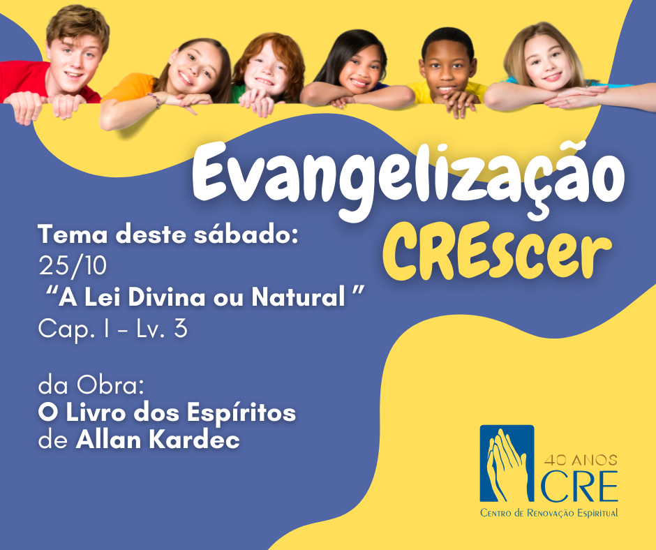 Queridos amigos, Neste sábado, 25/10/2025, às 10:00 no CRE, teremos aula sobre “A LEI DIVINA OU NATURAL” – Cap I – Lv. 3, da obra de Allan Kardec- “O Livro dos Espiritos”. Acesse o link https://forms.gle/N75UFMsmne77vAY5A, faça sua inscrição e receba mais informações por e-mail. Esperamos você e sua família! #credigital, #evangelizacaonocre, #sabadoonline, #projetocrescerdigital