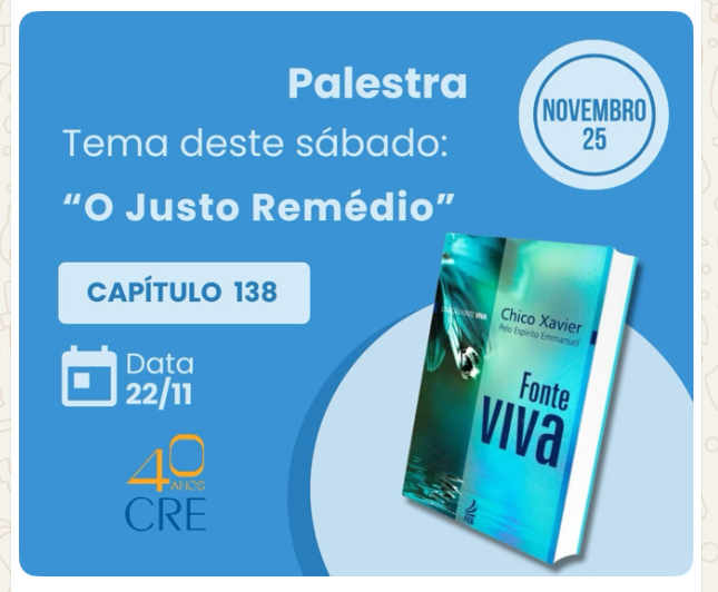 O tema da palestra deste sábado, 26 de Julho, será “O JUSTO REMÉDIO” Cap 138 do livro Fonte Viva, por Emmanuel, psicografado por Francisco Cândido Xavier.
