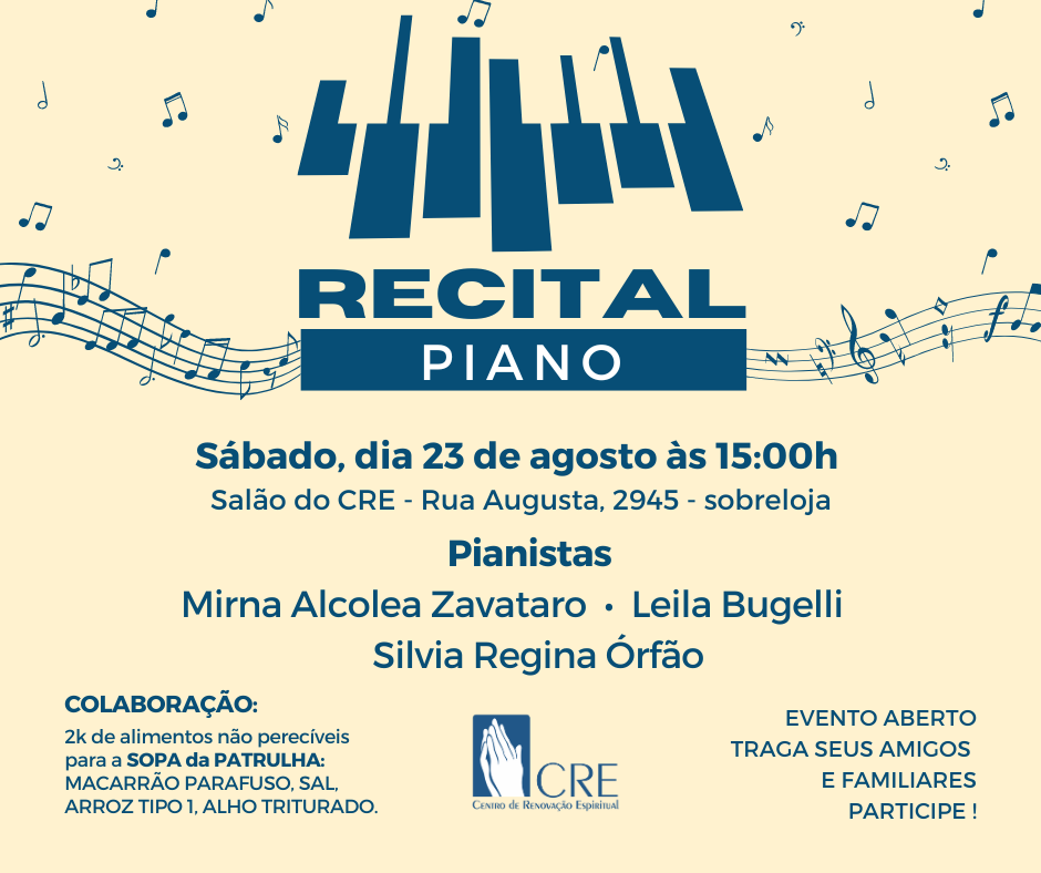 Venha passar uma agradavel tarde de sábado, no dia 24 de agosto com as pianistas Mirna Zavataro, Leila Bugelli e Silvia Regina Órfão numa performance a seis mãos.